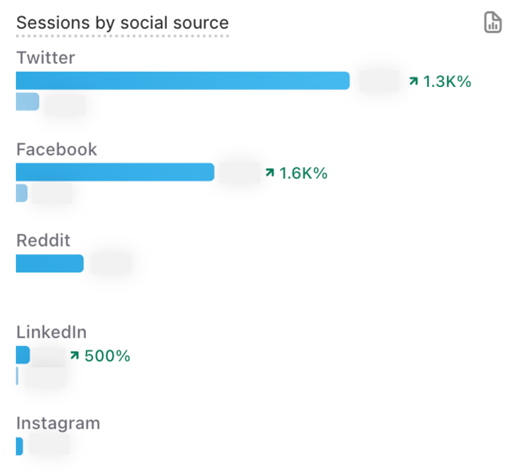Sessions by social source has seen the most improvement, with 1300% increase in Twitter and a 1600% increase in sessions from Facebook, which is most impressive considering the established Facebook presence already.